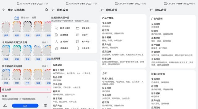为了让用户获得更优质的产品使用体验,华为应用市场还提供了易读易懂的隐私标签,定义了12大类52项数据及6大业务场景,涵盖了大部分APP的数据采集和使用的方方面面。当你在华为应用市场下载APP时,可以找到应用介绍部分下面的隐私政策,里面用标签化、瀑布流的方式,清晰地列举出APP收集的数据类别和数据用途,你可以清晰的了解APP在运行过程中可能收集的个人信息,以及这些数据将作何用途等,帮助你在读懂理解的基础上对应用做出选择。