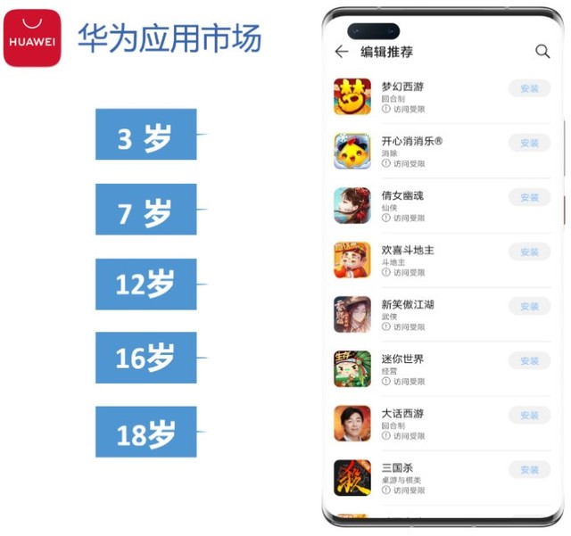 更值得一提的是,华为应用市场的应用分级制度也为儿童构建了特别的保护。儿童帐号登录下只展示适龄应用,不向儿童提供评论、论坛、个性化内容等服务。3岁、7岁、12岁、16岁、18岁,如此细致的分级分类,足见华为应用市场对儿童隐私安全的关怀备至。