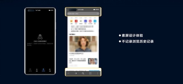无痕浏览——做个隐形人。打开华为浏览器,点击右下角打开控制面板,点亮“无痕浏览”图标,即可进入无痕浏览模式。该模式下,你的任何搜索、浏览和访问的历史信息均不会被记录和保存,素屏设计也提升了使用体验,让你安心畅游、隐私无忧。