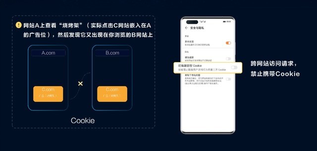 智能防跟踪——甩掉跟踪者。华为浏览器的“智能防跟踪”功能可以提前识别跟踪型网址,并同步到你的手机。当你访问这些网址时,浏览器会发送请求自动禁止携带跟踪Cookie,从而阻断这种跨网站的跟踪行为。以上操作全部在手机中完成,保护隐私的同时不会影响正常网站的使用。