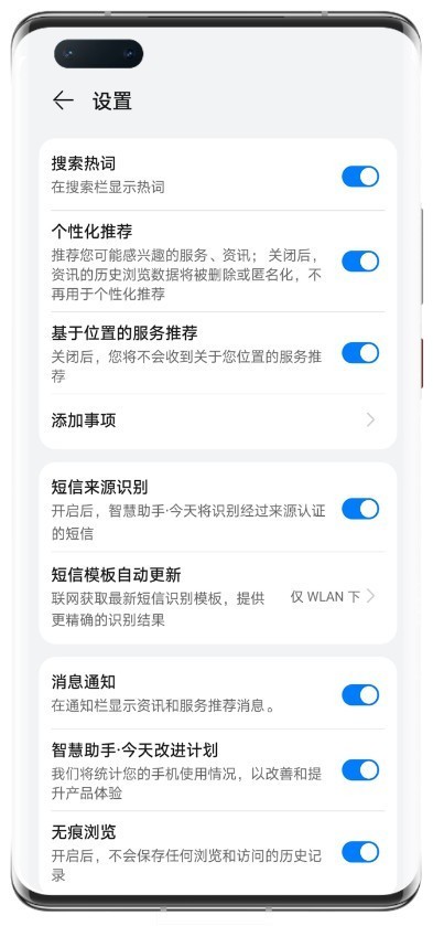 在华为智慧助手·今天的设置中,你可以自主启停个性化推荐、基于位置的服务推荐、消息通知、无痕浏览等服务,自己掌控个人数据。例如:当你关闭“个性化推荐”之后,资讯的历史浏览数据将被删除或者匿名化,华为智慧助手·今天也不会使用你的浏览历史做个性化推荐。