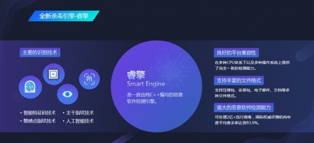 瑞星新一代导线式防毒墙RSW-NL应用了瑞星公司自主研发的AI网络威胁检测引擎技术,该技术的核心引擎——睿擎,可以通过智能特征码技术、敏感点指纹技术、主干指纹技术和人工智能技术从不同维度识别恶意程序并进行匹配,同时通过人工智能技术,针对不同类型文件设计不同的特征工程,利用机器学习新兴恶意软件的的变化趋势,预判未知病毒。